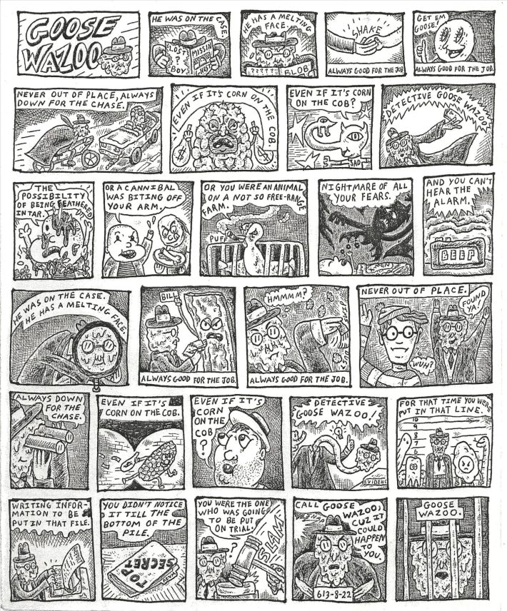 Davey Jones has been making catchily eccentric rock music for a few years now, most recently on his band Lost Boy ?'s 2015 debut full-length, Canned. Next month, he'll release Goose Wazoo, a loose concept album centered around the titular character, a detective in the form of a blob. The title track and lead single serves as his offbeat theme song: "He was on the case/ He has a melting face/ Always good for the job!/ Never out of place, always down for the chase," Jones sings over jangly harmonies. The kicker is his calling card: "Call Goose Wazoo/ 'Cus it could happen to you." The song is accompanied by a comic that echoes the narrative and sets the scene -- listen and read below.