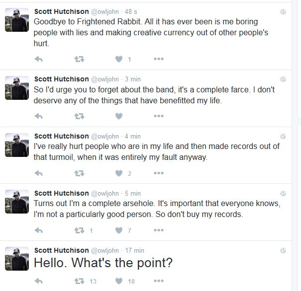If you've ever listened to the indie band Frightened Rabbit, it might not surprise you that frontman Scott Hutchinson knows how depression feels. And recently, that depression manifested itself on Hutchison's Twitter, where the musician had what he calls "a bit of a meltdown." In a string of since-deleted tweets, Hutchinson caused fans to fear for both the existence of the band and his own personal health. In a quick five-tweet spree, Hutchinson wrote things like these: "Turns out I'm a complete arsehole," "I'd urge you to forget about the band, it's a complete farce," "Goodbye to Frightened Rabbit." Nothing ever dies on the internet, and here's the screengrab:
