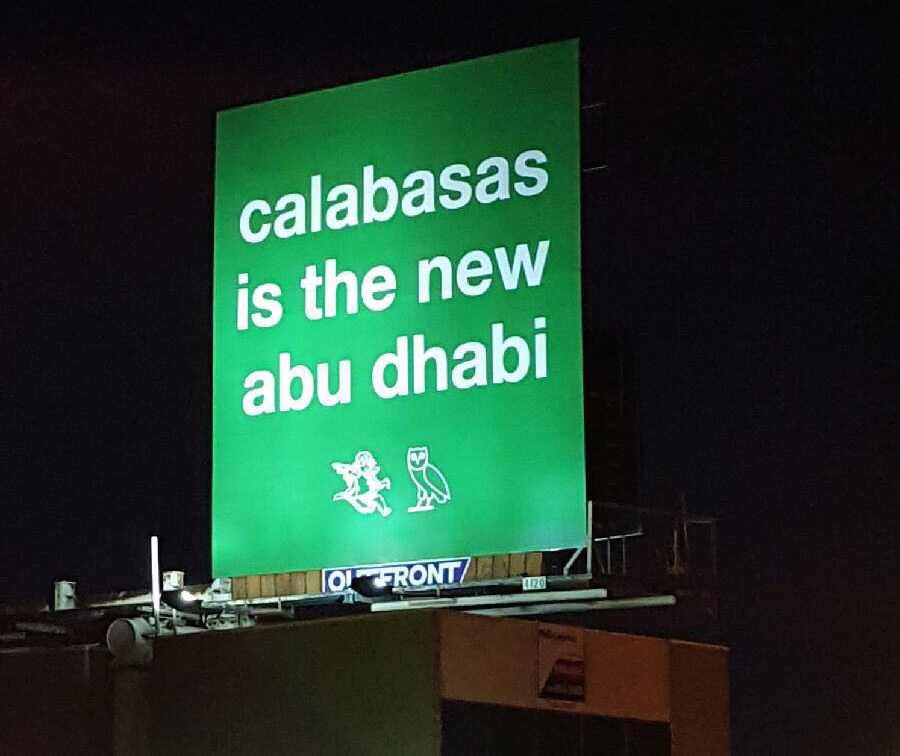 Billboard loves Drake, and Drake loves billboards. Nearly six months before VIEWS actually came out, Drake started teasing the album with mysterious billboards, and now he's teasing something else with a mysterious billboard. Kanye West announced that he was working on a joint album with Drake during his performance at OVO Fest earlier this month, and now Drake has put up a billboard featuring the GOOD Music and OVO Sound logos under the phrase "Calabasas is the new Abu Dhabi." See below.