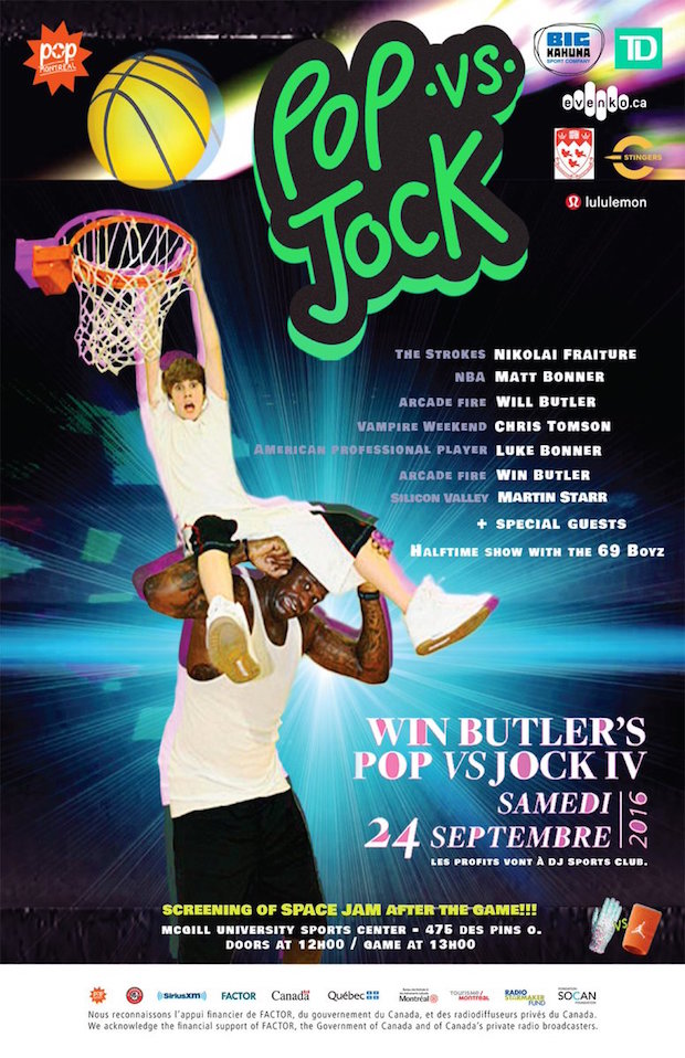 The fourth edition of the Pop Vs. Jock celebrity basketball game is set to go down later this month in Montreal. Players this time around include event organizers Win and Will Butler of Arcade Fire fame, the Strokes' Nikolai Fraiture, Vampire Weekend's Chris Tomson, Silicon Valley star Martin Starr, and basketball players Luke Bonner and Matt Bonner, plus some special guests. There's going to be a halftime performance by the 69 Boyz, and a screening of Space Jam after the game. It'll take place at the McGill University Sports Center on 9/24 at noon -- tickets available here.