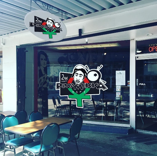 As The Business Journal reports, Fresno Grizzlies Marketing Director Sam Hansen (who once helped design merch for Kanye West) has teamed up with the Fresno restaurant Take 3 Burgers to transform it, for one day only, into Powamekka Café. Shakur left behind sketches for the Powamekka logo and menu ideas, and Hansen says he used those to put together the pop-up restaurant. He also worked with Take 3 to put together a new menu, which includes things like the California Love chicken sandwich and Thug Love cake pops.
