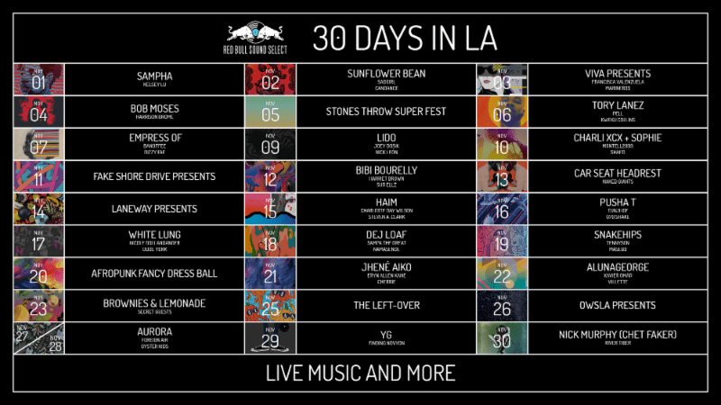 Red Bull Sound Select is returning to Los Angeles for a third year for their 30 Days In LA event series, which takes place at a bunch of different venues around the city. Artists playing this year include HAIM, Pusha T, Charli XCX + SOPHIE, YG, Sampha, White Lung, Car Seat Headrest, Empress Of, Dej Loaf, Jhené Aiko, Kweku Collins, Nicole Dollanganger, and more. Also included in this year's festivities are the Stones Throw Super Fest (a two-day fest celebrating the 20th anniversary of Stones Throw Records), Fake Shore Drive Presents (featuring Jeremih), Laneway Presents (highlighting Australian acts), OWSLA Presents (featuring the Skrillex-associated label) and the AFROPUNK Fancy Dress Ball. Tickets for all the events go on sale on 9/20 at 10AM -- more information and the full schedule can be found here.