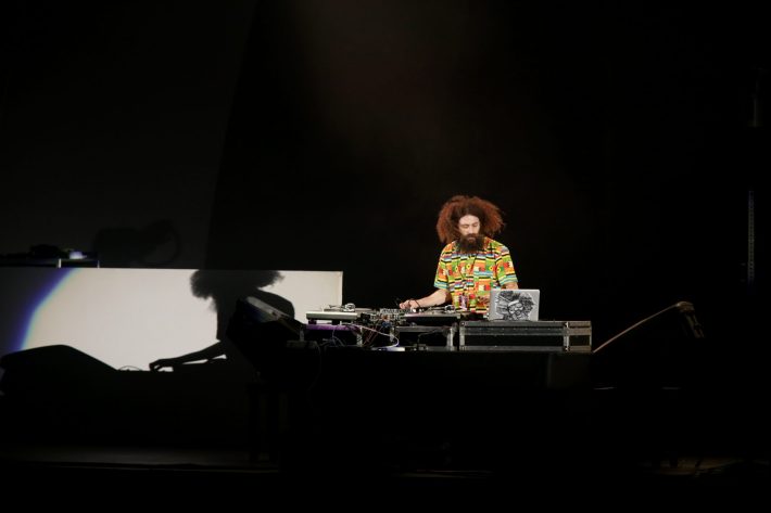 Of all the performances, his was the most far-ranging. It followed a trajectory familiar to anyone experienced in psychedelic drugs, starting with a series of languid, introspective movements that were equally beautiful and unnerving and inscrutable. Ellison's beats were based in hip-hop and they spun with slick, roller-skating grace or a lolling, off-kilter kathump reminiscent of a flat tire on a city street. For a good 30 seconds he unloaded a bassline that consumed all the air in the place like some kind of barometric pressure drop. He played a noisy, crunchy new tune that he said is coming out next week. "Los Angeles, ride shotgun with me," he said, referring to his habit of testing his new material by bumping it REAL LOUD while cruising his hometown.