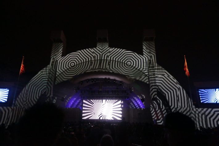"The best thing about tonight is connecting all these universes together," Ellison told the crowd midway through his hourlong headlining set. He played from a podium ensconced between two giant screens, unseen except in silhouette, with projection-mapped visuals blasting swirling geometry onto the soaring arches of the Bowl's bandshell.