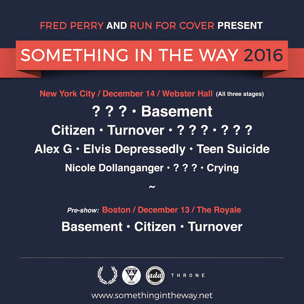 On 12/14, Run For Cover (alongside Fred Perry) are throwing the inaugural Something In The Way Festival at Webster Hall in New York City, and the lineup includes some of the best of the RFC roster and its affiliates: Alex G, Elvis Depressedly, Teen Suicide, Nicole Dollanganger, Crying, Basement, Citizen, and Turnover are all confirmed to play, and there are a few special guests that will be announced at a later date. In addition, Basement, Citizen, and Turnover will play a special pre-show the night before (12/13) at the Royale in Boston.