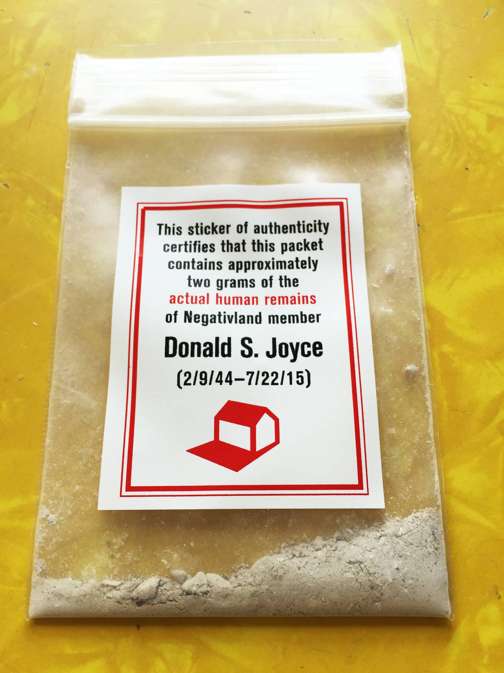 So it kind of makes sense that the album would come with two grams of Don Joyce's actual cremains and one of Joyce's handmade audio tape loop "carts" used in the creation of Over The Edge and Negativland live performances between 1981 and 2015. But for all of you who are still kind of creeped out (like me), the band adds:
