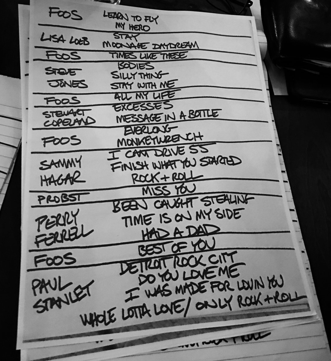 Foo Fighters ended their 11-month hiatus with a huge surprise concert in Los Angeles last night to benefit area schools. The gig featured an all-star cast of performers doing some of their most famous songs with Foos as their backing band. So in addition to Dave Grohl hits like "Everlong" and "All My Life," a few hundred donors got to see Lisa Loeb, the Sex Pistols' Steve Jones, the Police's Stewart Copeland, Van Halen's Sammy Hagar, Jane's Addiction's Perry Farrell, and KISS' Paul Stanley kicking out the classics. Survivor host Jeff Probst also stopped by to cover the Rolling Stones because why not? Below, check out the full setlist and watch footage of the band covering Led Zeppelin's "Rock And Roll" with Hagar and Jason Bonham.
