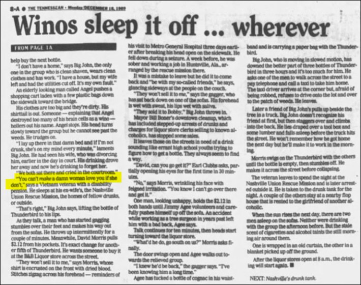 SHAMBLIN: The way I remember what was said in the story, there was a guy living under a bridge, somewhere close to downtown Nashville, and in the story, he said his wife came to pick him up, under the bridge, and took him down to the courthouse to get a divorce. And he said, "We hugged, and we cried, and then we went through the divorce." And he said, "You know, you just can't make a woman love you."