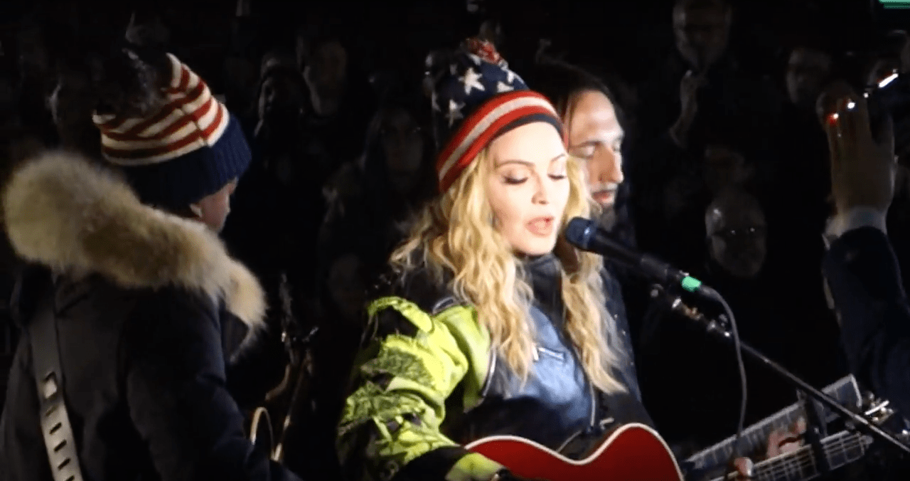 Madonna played a surprise concert in support of Hillary Clinton at NYC's Washington Square Park last night. The Queen Of Pop didn't reveal the location of the show until moments before singing. The Daily News reports that she performed “Express Yourself,” “Rebel Heart,” “Like A Prayer," and a cover of John Lennon's "Imagine." Madonna officially endorsed Clinton back in September, and last night she said that a Clinton presidency would be "about unifying us. It’s about keeping America great. Not making America great.” Check out footage from her performance below.