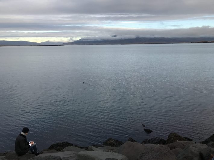There's a highway that wraps around the end of Reykjavik — to one side is town, to the other is the Atlantic Ocean, and mountains off in the distance. It's a surreal sight, on the days where it's actually clear enough to see those mountains. Aktu Taktu is on that highway, so after everyone finishes their burgers and fries we walk across the road to the path overlooking the water. There's a wall of black rocks leading down to the water, and Kaktus quickly starts climbing down them. This became an important spot for the band. They'd come hang out on the rocks looking out at the water. Gulli mentions the time he was “really fucked up on MDMA” sitting there in total darkness, listening to the wind and water.