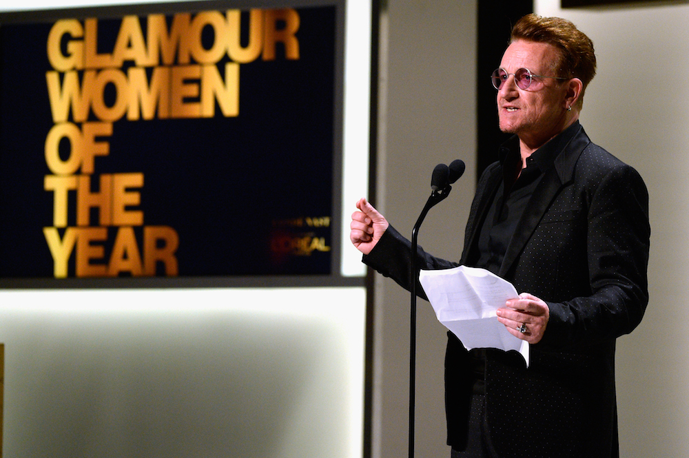 Earlier this month, Bono inexplicably became the first man to be awarded Glamour's Woman Of The Year award, and last night at a ceremony in Hollywood, he accepted the honor, which he himself described as "ridiculous." He was introduced by Amy Poehler who, after cracking a few jokes about the absurdity of the situation, got serious for a moment: "People like Bono give me faith in men. [He's] dedicated his life to being a light for so many who are scared and alone."