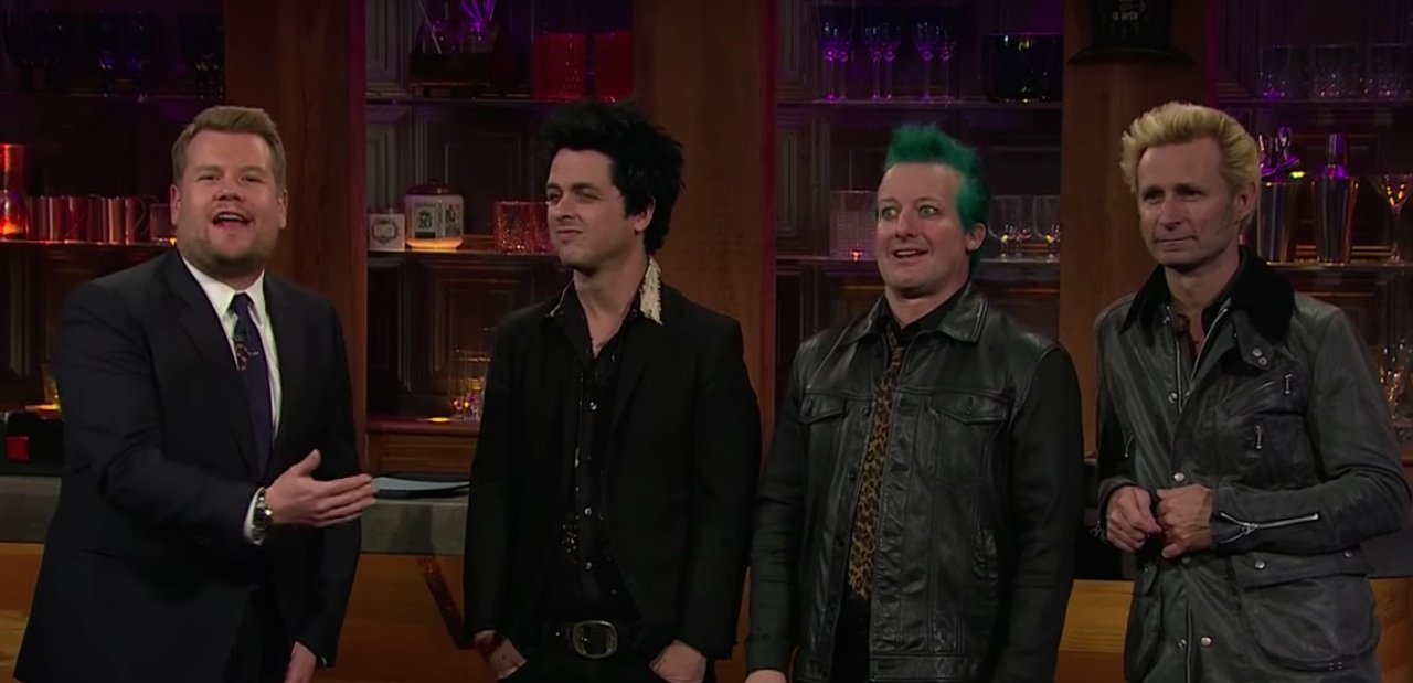 Green Day have been hitting the promo circuit hard this week. In just the past few days, they've performed on the American Music Awards, Jimmy Kimmel Live, and now The Late Late Show With James Corden. And during the AMAs, while performing their single "Bang Bang," they famously surprised producers by launching into an anti-Trump chant. On Corden last night, Billie Joe Armstrong talked about how the band hadn't rehearsed the chant how the show presented them a good opportunity to start challenging everything Trump stands for. (He also gave credit to the band MDC for originating the chant.) Below, watch Green Day's interview with Corden and another fired-up "Bang Bang" performance, this time with bleeps.