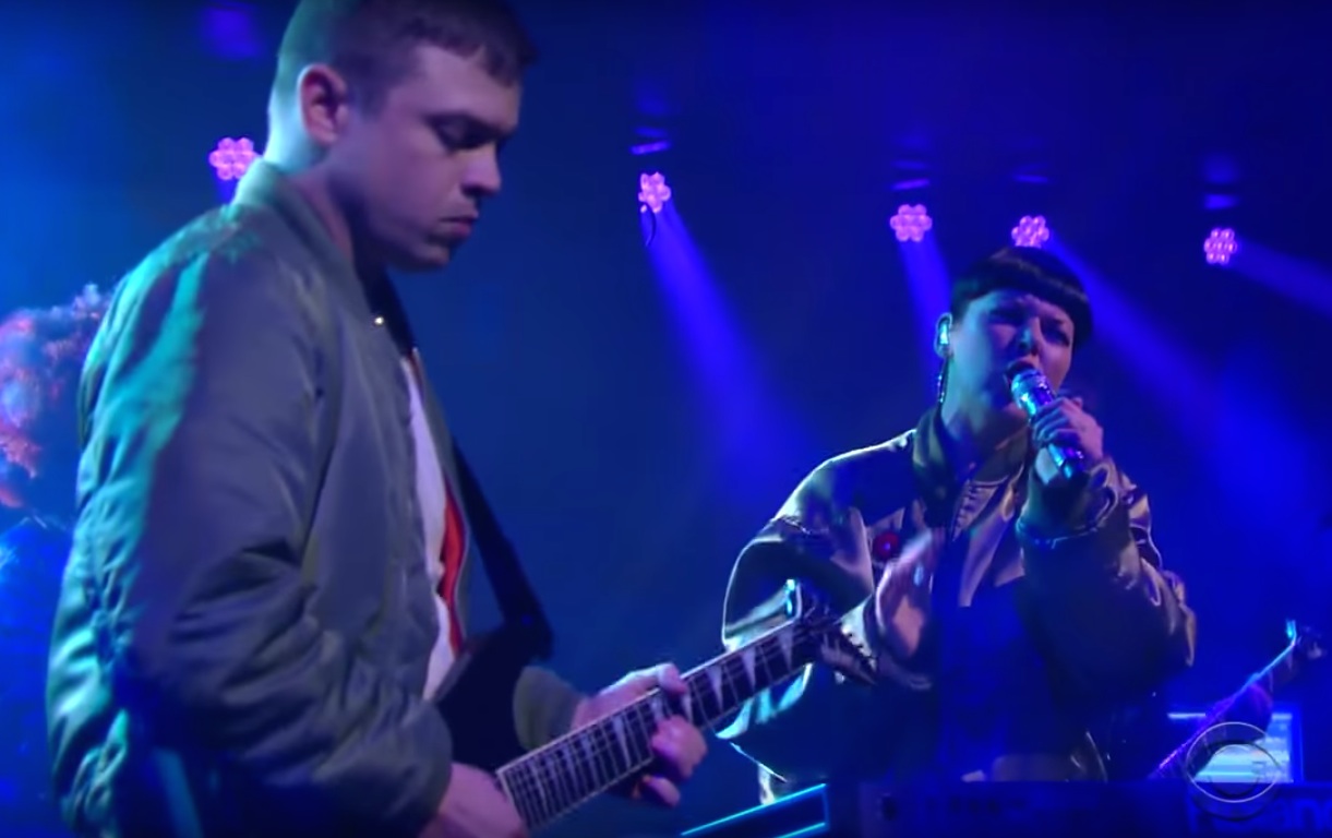 Last month, Sleigh Bells returned with the new album Jessica Rabbit. And while serving as musical guests on The Late Show With Stephen Colbert last night, the duo performed "I Can Only Stare," the album's best song. Sleigh Bells are now far enough from their DIY beginnings that they're performing with a second guitarist, a backup singer, and a pretty serious light display, but they still have plenty of that old intensity. Alexis Krauss played a little keyboard during the performance and also showed some real vocal firepower. Watch it below.