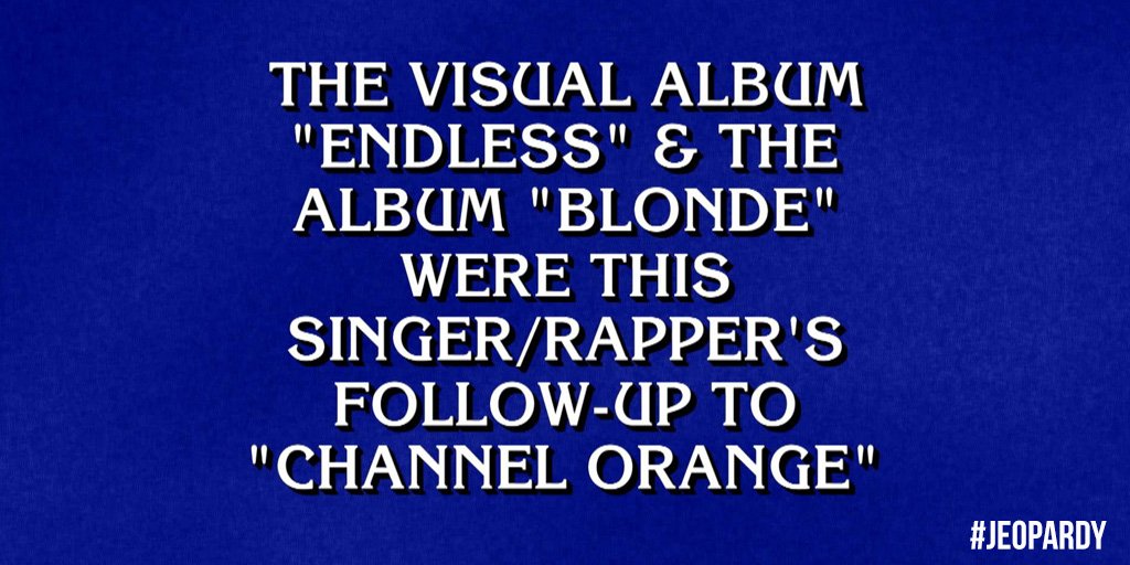 Frank Ocean has been an answer on Jeopardy! before, and on Wednesday, the singer made his triumphant return to the show. The clue was "the visual album Endless and the album Blonde were this singer/rapper's follow-up to Channel Orange," so it looks like someone over at Jeopardy! is a fan! Probably Alex Trebek. I can totally see that guy bumping Blonde.