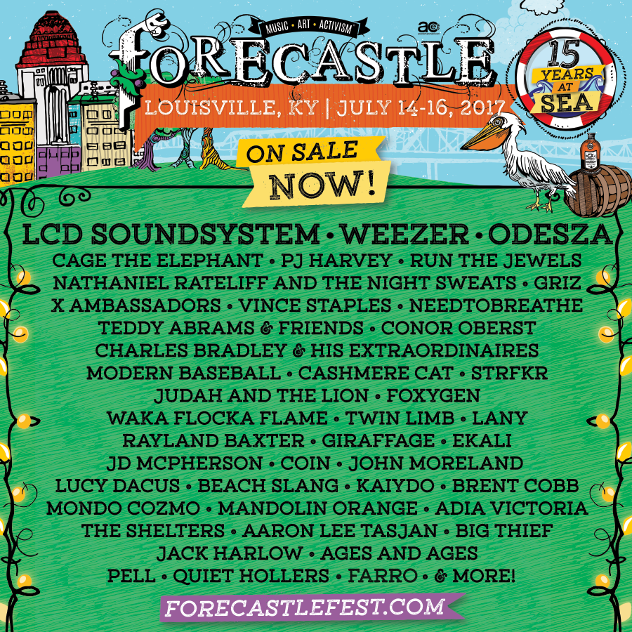 Forecastle is returning for its 15th year this summer, and the Louisville, Kentucky festival has just announced its initial lineup. Festival headliners extraordinaire LCD Soundsystem are headlining alongside Weezer and Odesza, and the rest of the eclectic lineup includes Run The Jewels, PJ Harvey, Vince Staples, Conor Oberst, Modern Baseball, Beach Slang, Foxygen, Lucy Dacus, Cashmere Cat, STRFKR, Waka Flocka Flame, and Big Thief. Oh, and a lot of bourbon. It all goes down 7/14-16 at Louisville's Waterfront Park, and you can buy tickets here or check out the full lineup below.