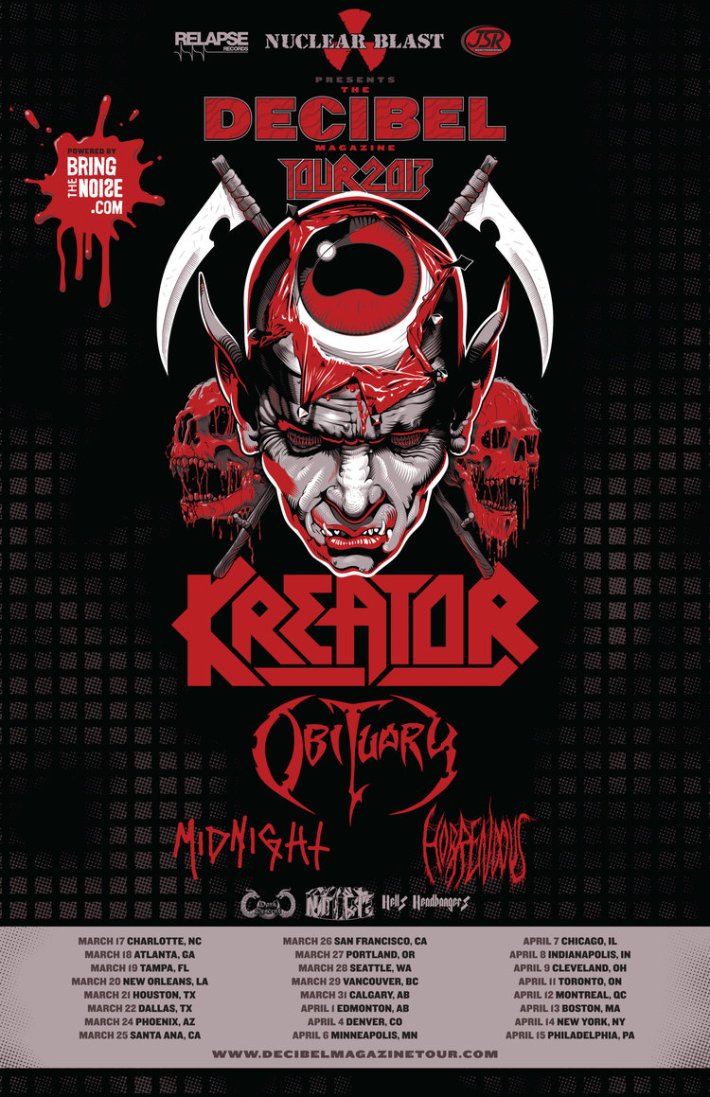 YUP. Good fucking lord yes. Moving on, regarding the latter line item: I went long on Gods Of Violence's Molotov cocktail lead single/title track in November's Black Market; it probably woulda come in at #1 on my list of the top songs of 2016 if it hadn't dropped on me so late in the year. Kreator are the best fucking band. They were my first favorite "extreme" metal band when I was 15, and today, they're even better and more necessary than ever before. They're headlining next year's Decibel Magazine Tour, and to help get the word out, the band teamed up with the mag to share a new track that was (somehow) left off the LP proper.