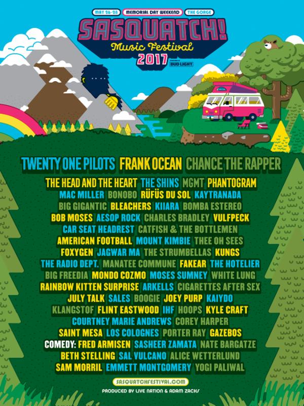 Sasquatch! is returning to George, Washington over Memorial Day weekend, and the festival has just unveiled this year's lineup. Frank Ocean, Chance The Rapper, and Twenty One Pilots are headlining, and the bill also includes the Shins, Car Seat Headrest, American Football, White Lung, Kaytranada, Thee Oh Sees, the Hotelier, Mac Miller, Aesop Rock, the Radio Dept., MGMT, Phantogram, Moses Sumney, Foxygen, Jagwar Ma, and Mount Kimbie, plus a comedy lineup featuring Fred Armisen and Sasheer Zamata. The fest runs 5/26-28 at the Gorge Amphitheatre, and tickets go on sale here on Saturday. Check out the full lineup below.