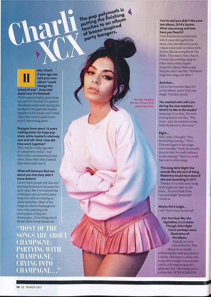 We caught up with Charli XCX at the end of 2016, and here in 2017 she's continuing to give interviews promoting her upcoming album. One such conversation appeared in the pages of British music mag Q, but Charli was kind enough to share it on Facebook today. Probably the most intriguing remark involves her experience working with will.i.am: