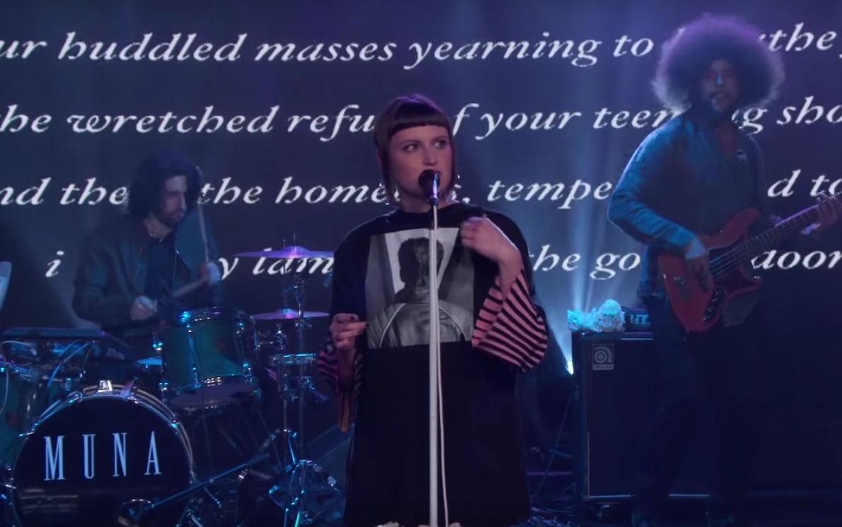 A year and a half ago, Los Angeles synthpoppers MUNA were a Stereogum Band To Watch. Today, they've got a major-label album out in the world. And last night, they got to perform two of its songs on the Jimmy Kimmel Live! stage. On the show proper, they performed "I Know A Place," the single from their new LP About U, in front of a projection of the Statue Of Liberty inscription. In a great moment, added lyrics about standing up in resistance to Donald Trump. And as an online bonus, they also played the album track "Crying On The Bathroom Floor." On both songs, they looked like they're built for this. Watch the performances below.