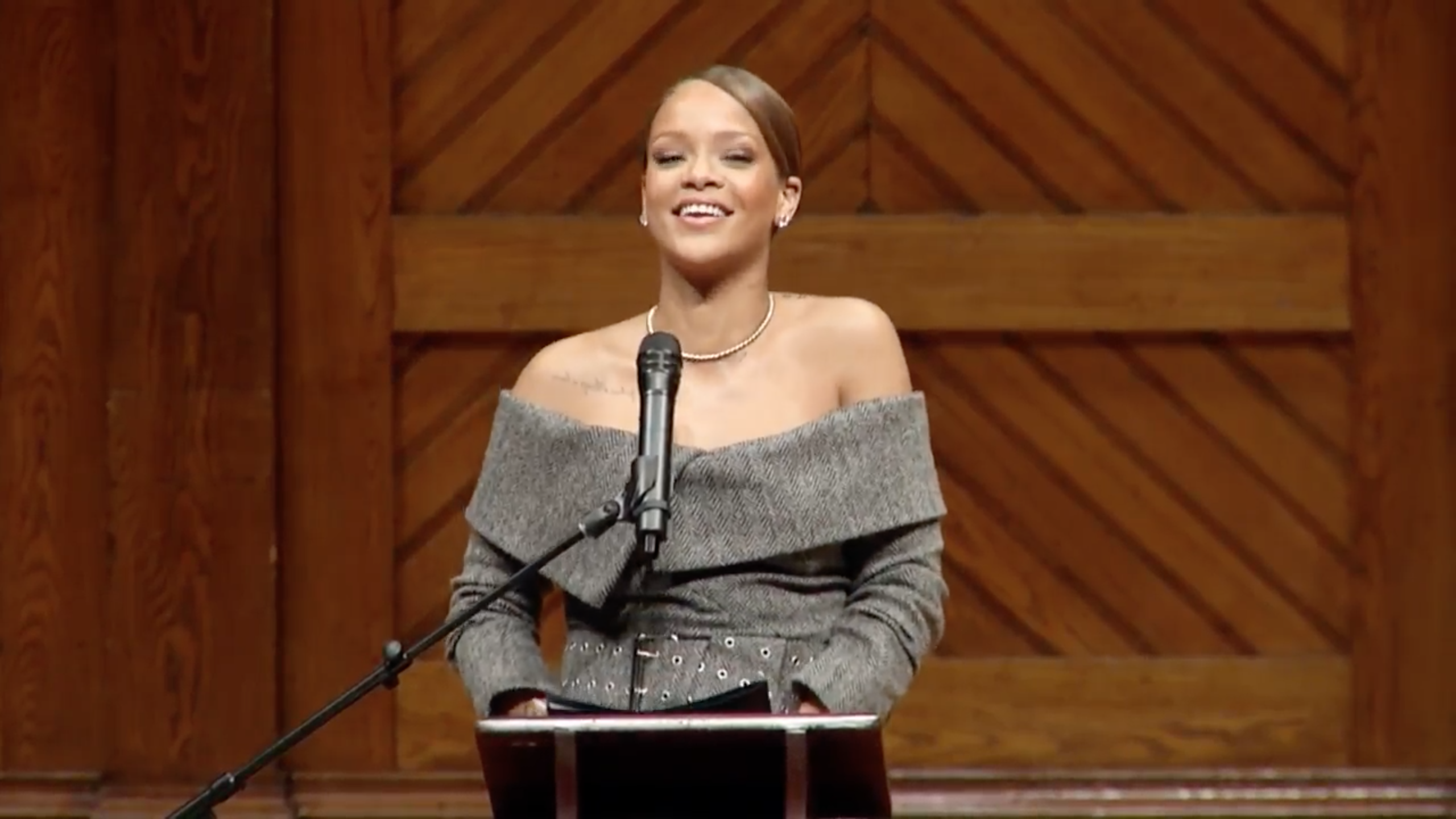 Rihanna opened her acceptance speech with, "So I made it to Harvard -- never thought I'd be able to say that in my life," before going over her history of humanitarian work and outlining her values: "We're all human, and we all just want a chance: a chance at life, a chance at education, a chance at a future, really." She concluded by saying, "You don't have to be rich to help somebody," leaving the crowd with some wisdom from her grandmother: "If you got a dollar, there's plenty to share." You can rewatch the livestream of the event below. Rihanna takes the stage about one hour and 13 minutes into the video.