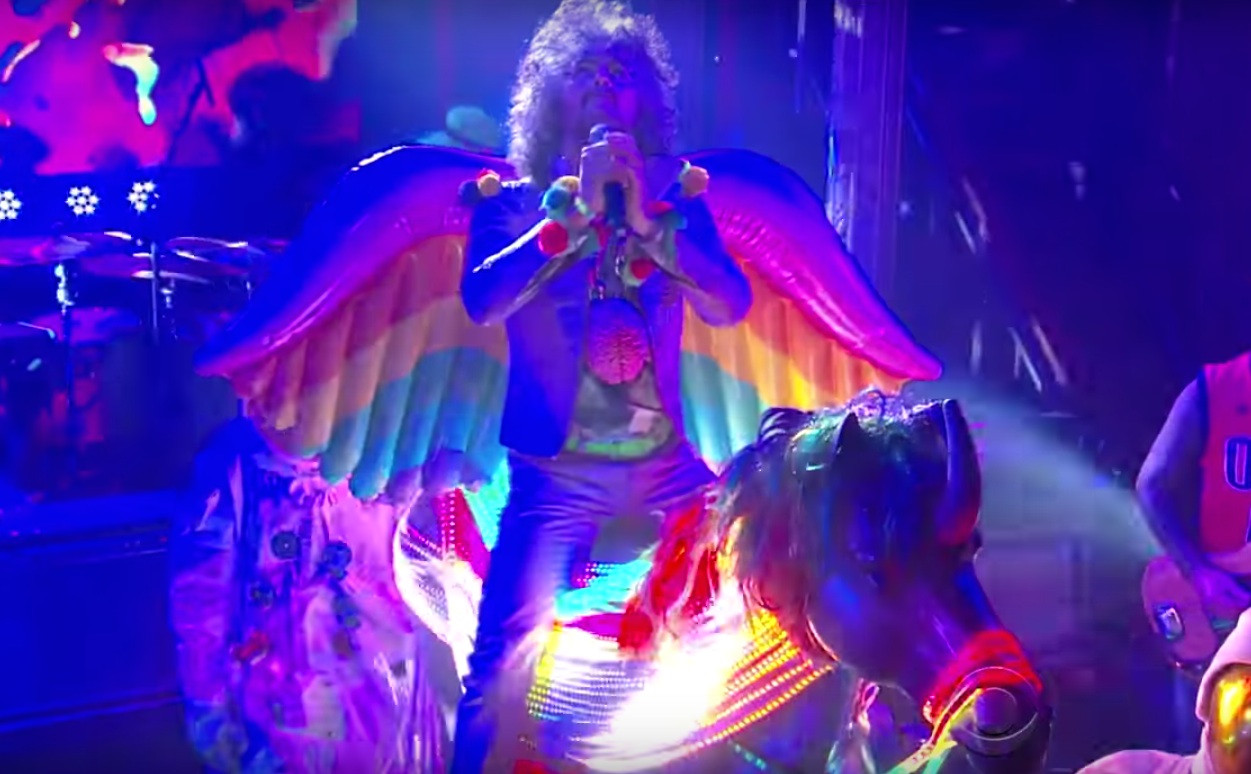 The Flaming Lips might not blow minds as reliably as they did a decade or two ago. But when you give them a chance to perform on TV, they still do everything in their power to make it an experience. Case in point: Last night, the Lips were the musical guests on Stephen Colbert's Late Show. They played "There Should Be Unicorns," a deep cut from their new album Oczy Mlody. And they went all the way in with it. Wayne Coyne wore rainbow-striped inflatable angel wings, and he sat on the back of a unicorn statue that was covered in lights. Psychedelic lights spiraled around the whole band. There was an astronaut onstage for some reason, possibly to keep the unicorn statue calm. It was really something. Watch the performance below.
