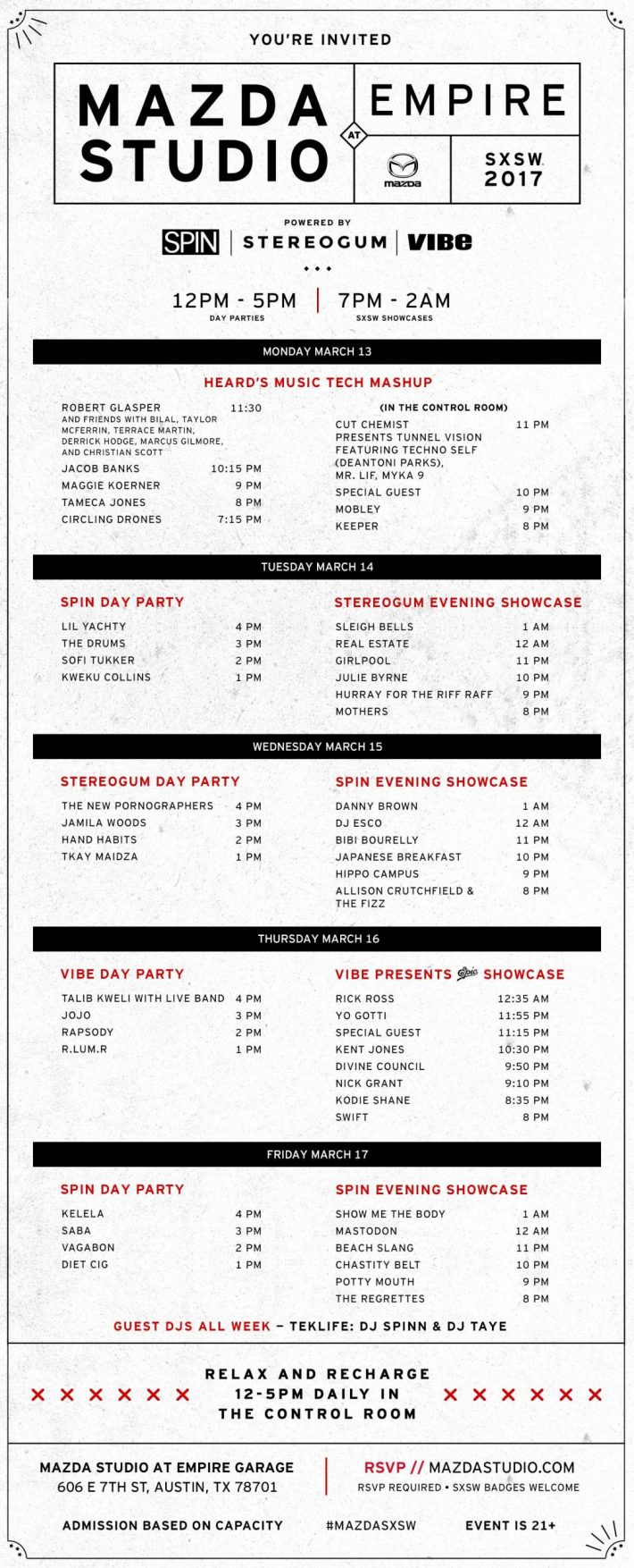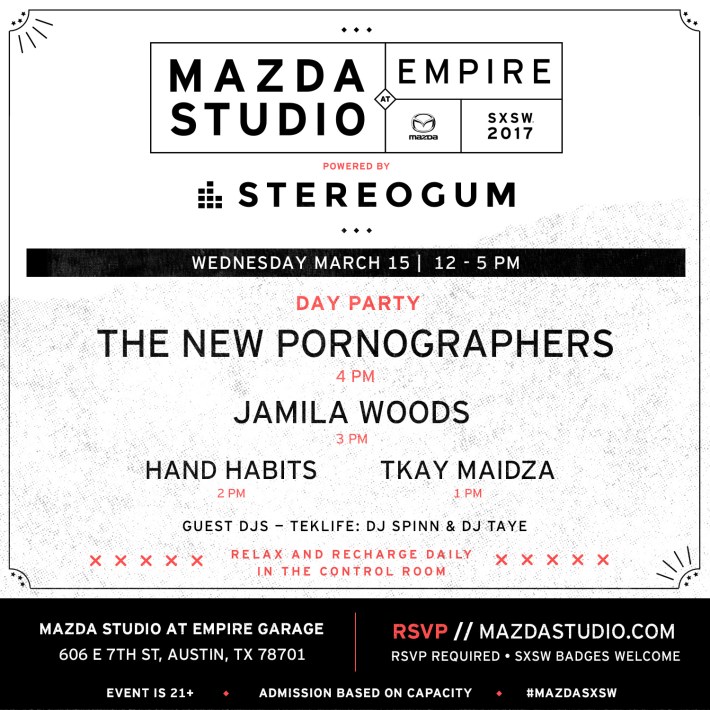 Stereogum returns to SXSW next week for two official showcases featuring artists you know and love from this site. Alongside our friends at SPIN and Vibe, we've partnered with Mazda to take over Austin's Empire Control Room and Garage (located at 606 E. 7th St., right in the heart of all the SXSW action) for a week of day parties and evening/late night showcases focusing on innovation in technology and music.