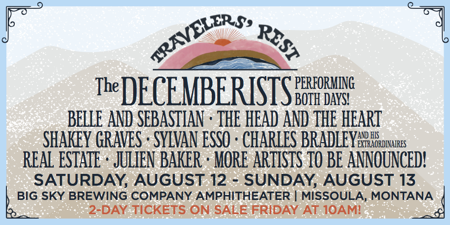 The Decemberists have made their own festival! It's called Travelers' Rest, and the inaugural edition will take place on 8/12-13 at the Big Sky Brewing Company Amphitheater in Missoula, Montana. (Colin Meloy was born and raised in Montana, hence the location.) The Decemberists will headline both days, and the rest of the lineup is rounded out by Belle & Sebastian, the Head And The Heart, Shakey Graves, Sylvan Esso, Charles Bradley And His Extraordinaires, Real Estate, Julien Baker, and more that will be announced at a later date.