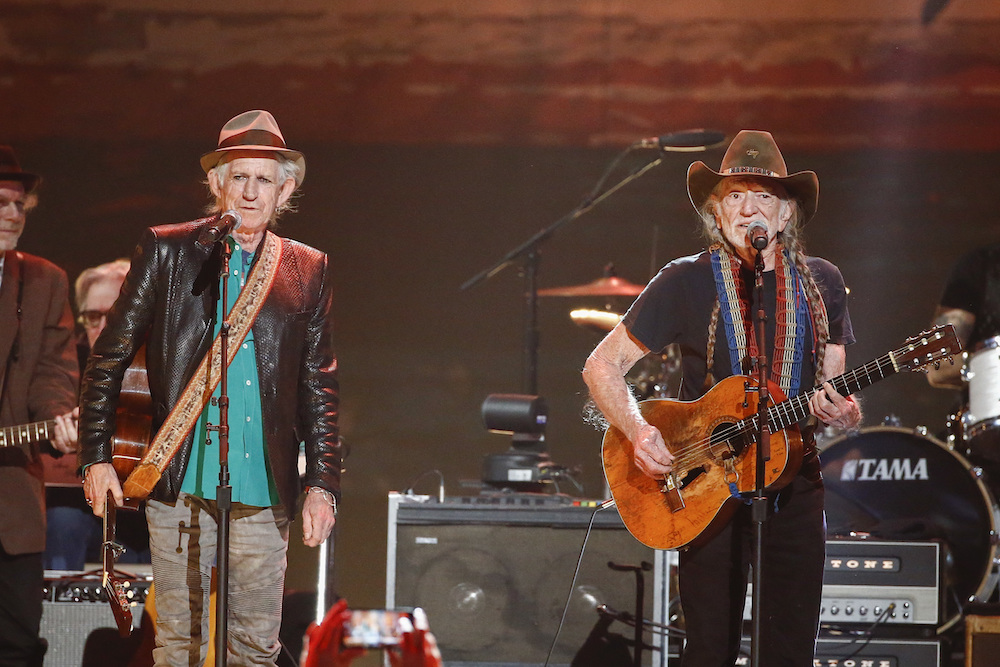 Last night, on the one-year anniversary of Merle Haggard's death, a ton of artists gathered together at the Bridgestone Arena in Nashville for Sing Me Back Home, a tribute concert for the late musician. Keith Richards, Willie Nelson, Sheryl Crow, John Mellencamp, Kenny Chesney, Miranda Lambert, Loretta Lynn, Dierks Bently, Toby Keith, and many more were in attendance, and a few of their performances have surfaced online. (The entire concert is scheduled to air on TV at a later date). Below, watch Willie Nelson and Kenny Chesney duet on Nelson's old duet with Haggard, "Pancho & Lefty," see Keith Richards perform "Sing Me Back Home," and watch Miranda Lambert sing "Misery And Gin."