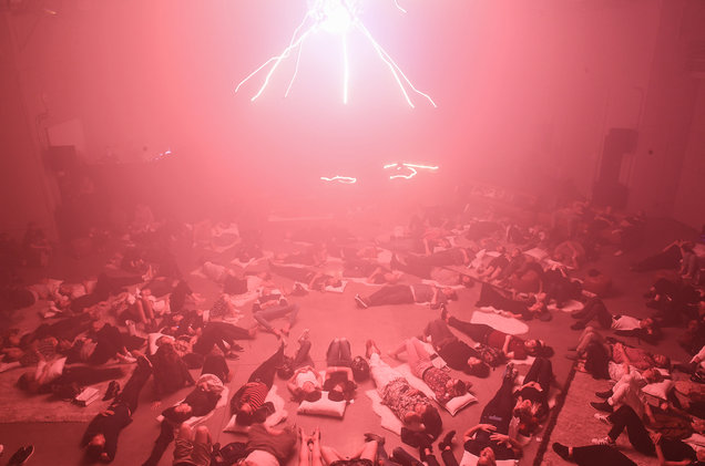 Beneath the sound booth were roughly 200 people strewn about on pillows, day beds, and rugs, laying prone beneath a transfixing light sculpture called a "Sólblossi" (Icelandic for "solar flare") designed by Juan Azulay that was like a heart with sinewy tentacles. And then there were three nearly-naked waifish male dancers who slunk about while holding candles. But what really brought the night together is something else entirely: edibles.