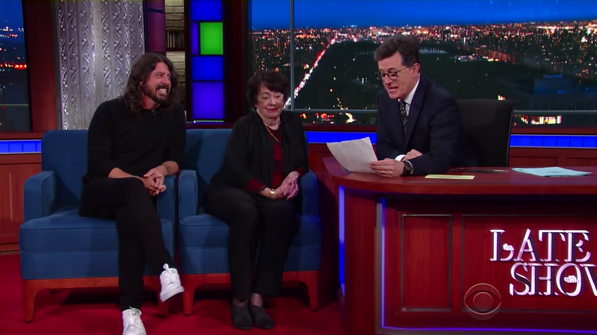 Dave Grohl's mom Virginia Hanlon Grohl published a new collection of interviews with the mothers of musicians called From Cradle To Stage: Stories From The Mothers Who Rocked And Raised Rock Stars. The mothers of Dr. Dre, Michael Stipe, HAIM, Zac Brown, Josh Groban, Pharrell, and more are featured. Dutiful son Dave has been helping his mom promote the book, and last night the two appeared on Colbert to chat about their relationship, among other things. Virginia seems like a chill mom! Watch below.