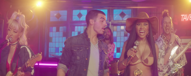 Last month, the Jonas-fronted pop machine DNCE released a song called "Kissing Strangers" that featured Nicki Minaj, and last night that single got a video that features the band members hitting up a convenience store before heading to a wild party that (thankfully) is attended by a dog in sunglasses. Nice! Nicki Minaj shows up when the band heads to a bar to perform. Watch below.