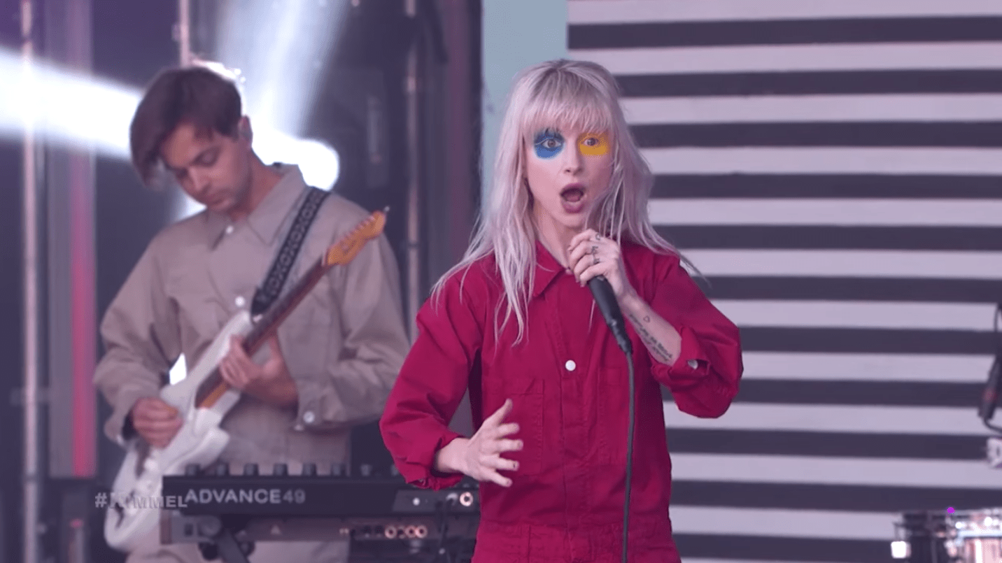 Paramore's promotional rounds in support of After Laughter brought them to Jimmy Kimmel Live!'s outdoor stage last night, replete with the colored jumpsuits from their promo photos. In addition to playing the project's lead single "Hard Times," they trotted out their last album's big hit "Ain't It Fun." Watch both vibrant performances below.