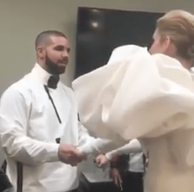 Both Drake and Céline Dion performed at last night's Billboard Music Awards, and they ran into each other backstage and exchanged some pleasantries. Well, Drake was more than pleasant, maybe even bordering on adorable, as he fawned over the fellow Canadian musician, calling her "very iconic" and saying "we love you" during their brief meeting. He added that he's "like a year away" from getting a Céline Dion tattoo. Dion, like any good mother, went on to make sure that her son met Drake. The interaction was captured on video. Check it out below.