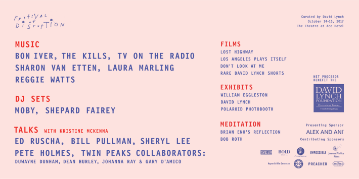 As with last year, the Festival Of Disruption will come to LA's Theatre At Ace Hotel. This time, it'll go down 10/14-15, and it'll feature Bon Iver, TV On The Radio, the Kills, Sharon Van Etten, Laura Marling, and Reggie Watts, as well as DJ sets from Moby and the artist Shepard Fairey. Writer Christine McKenna will host Q&A sessions with Lynch collaborators like Bill Pullman, Ed Ruscha, and Sheryl Lee. There will also be screenings of films like Lost Highway and rare Lynch shorts, an art exhibit from Lynch, and a meditation with Bob Roth. Here's the poster: