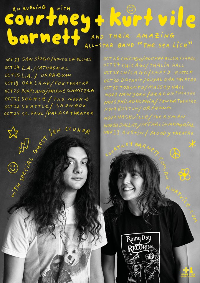 One of the most exciting indie rock news items this year was the hint of some forthcoming Kurt Vile/Courtney Barnett collaboration. Today the Philadelphia and Melbourne musicians, both masters of guitar-driven stoner rock of a sort, have announced an entire album together along with a tour to support it this fall. We don't get to know anything else about the album yet beyond its tantalizing existence, but we do know Vile and Barnett will be performing together backed by an "amazing all-star band" called the Sea Lice. The band comprises Janet Weiss (Sleater-Kinney, Wild Flag), Rob Laakso (The Violators, The Swirlies, Mice Parade), Stella Mozgawa (Warpaint), and Katie Harkin (Sky Larkin, touring member of Sleater-Kinney and Wild Beasts) -- so, yeah, that certainly qualifies as amazing.