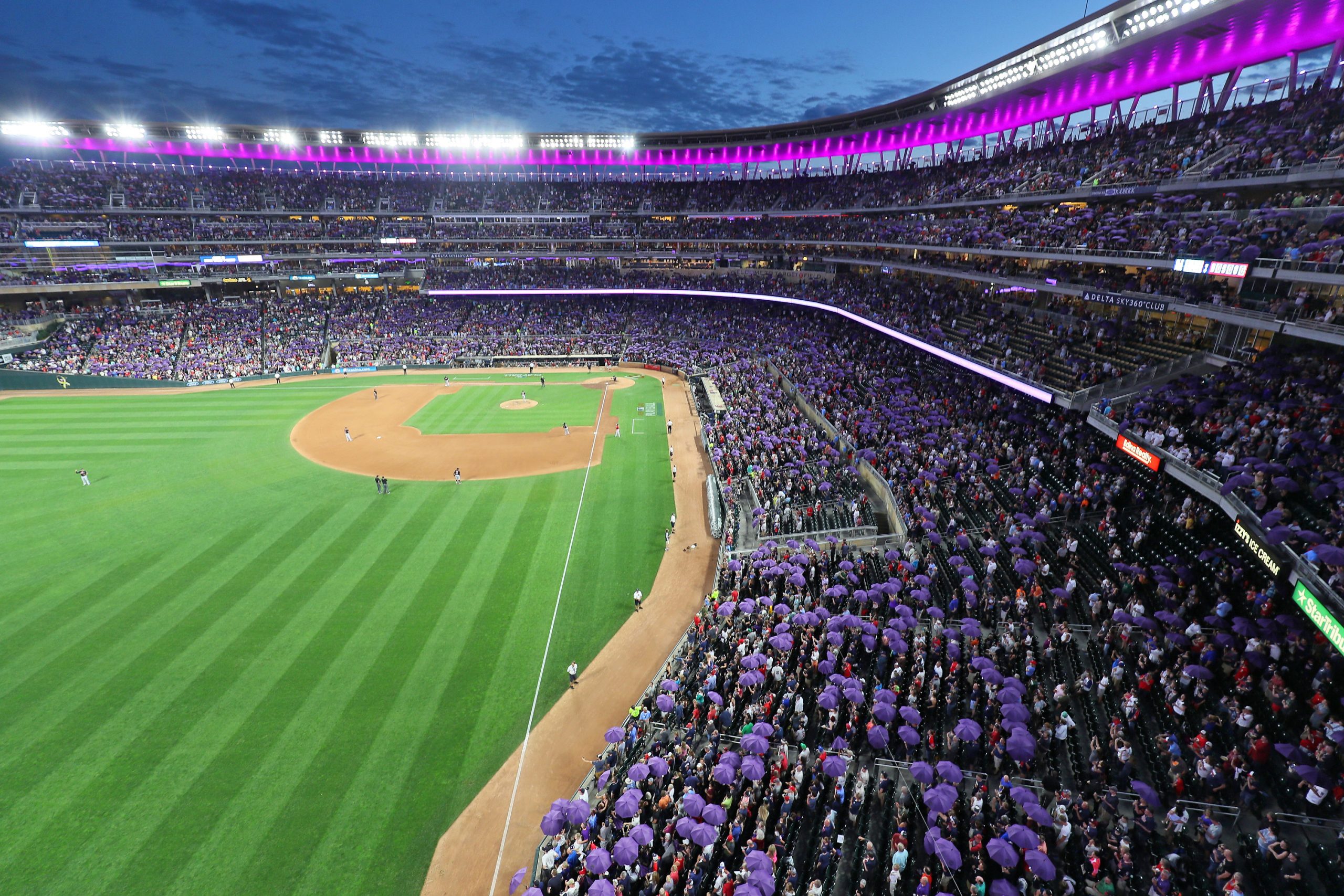 The Minnesota Twins honored the late Minnesota hero Prince by turning last night's game against the Cleveland Indians into an official Prince Night celebration. Prince music was piped into the stadium throughout the game, players warmed up with love symbol T-shirts, the first 10,000 fans to arrive at Target Field received a free Purple Rain umbrella, Prince-themed fireworks were set off at the end of the game, and everything was in purple. Check out some photos and videos from the festivities below.