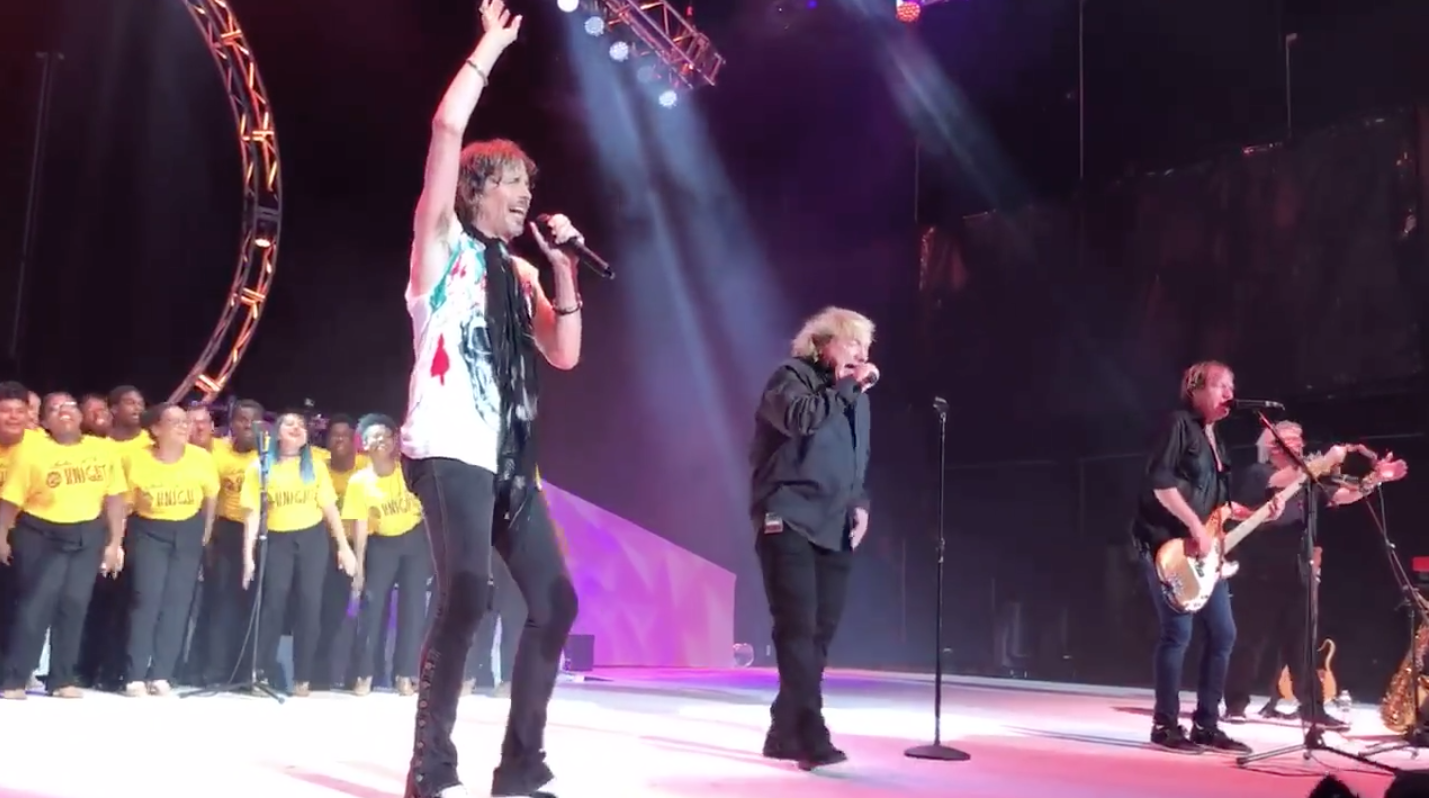 Foreigner have accomplished what their classic-rockin' peers Journey could not: They got their definitive lineup on stage to perform music together for the first time in decades. You may recall that original lead singer Steve Perry joined Journey for their Rock And Roll Hall Of Fame induction but did not perform with them. Last night at Nikon at Jones Beach Theatre in Wantagh, New York, Foreigner not only stood on stage with singer Lou Gramm, keyboardist Al Greenwood, and multi-instrumentalist Ian McDonald, they also performed together for the first time since 1980. As Ultimate Classic Rock reports, the erstwhile members appeared for a three-song encore including "Long, Long Way From Home," "I Want To Know What Love Is," and "Hot Blooded." Watch footage of all three songs below.