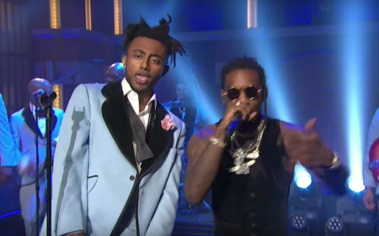 Last year, the 23-year-old Portland rapper Aminé had a huge viral hit with the defiantly silly hornball jam "Caroline," and he became one of this year's XXL Freshmen last month. Later this week, he'll release his debut album Good For You, which is a total joy, a way better record than anyone could've reasonably expected. And last night, he served as the musical guest on Late Night With Seth Meyers and made the most of it. He performed his latest single, the new laughing-at-my-exes anthem "Wedding Crashers," and wore a powder-blue tux. He also had a doo-wop quartet, all of them in matching tuxes, backing him up, and a guy dressed like a priest onstage. When the song's guest, Migos star Offset, showed up onstage, he was wearing the tuxedo pants but also a vest with no shirt and a whole lot of jewelry. The stagecraft was immaculate, and everyone involved seemed to be having a blast. Watch the performance below.