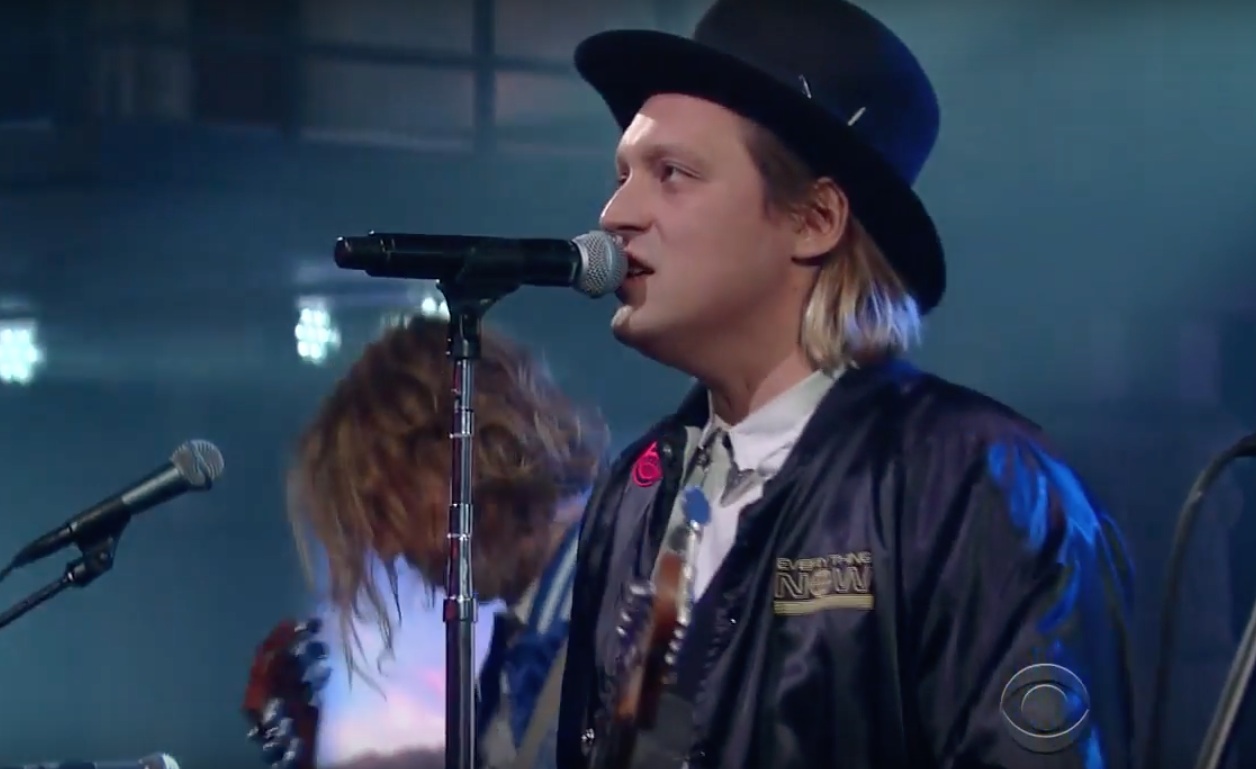 Arcade Fire have treated every aspect of the release of their new album, the not-exactly-beloved Everything Now, as a sort of performance-art stunt about corporate branding, and that apparently extends to late-night appearances. Last night, the band played on Stephen Colbert's Late Show, and Colbert went along with all their culture-jamming stunts. Before the band played, he held up a can of their Chemistry energy drink and aired a fake infomercial for the Everything Now corporation, and on Twitter, he also shared the band's fake list of demands. As for the performances, Arcade Fire played the album's title track on the show, and they also did an online-bonus performance of their single "Creature Comfort." They brought dry ice and keytars and made a whole production of it. Arcade Fire remain a ridiculously powerful live act, and these songs, performed by the whole army of them, gained a certain heft. Check out the performances and the list of demands below.