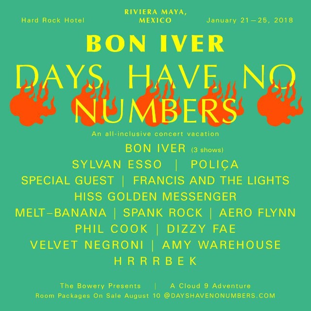 Bon Iver's Days Have No Numbers has gone the way of LCD Soundsystem's Beach Vibes Festival. The recently announced all-inclusive "concert vacation" at the Hard Rock Hotel in Riviera Maya, Mexico has been cancelled, according to the official website, and full refunds are being issued automatically to all booked guests. In addition to three sets from Bon Iver, the event, scheduled for January 2018, was set to feature performances by Sylvan Esso, POLIÇA, Francis And The Lights, Hiss Golden Messenger, Melt-Banana, Spank Rock, Aero Flynn, Phil Cook, and more. All mentions of the festival seem to have bee scrubbed from the band's social media pages.