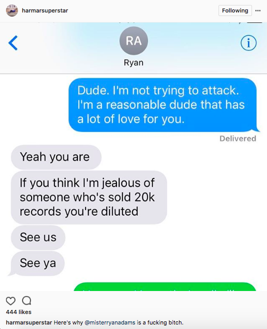 This morning when Har Mar Superstar, another veteran of the early-'00s New York scene, stepped in to intervene, Adams had words for him, too. And he also went on to refer to Father John Misty as "Elton Josh" and "Sir Fuckhead."