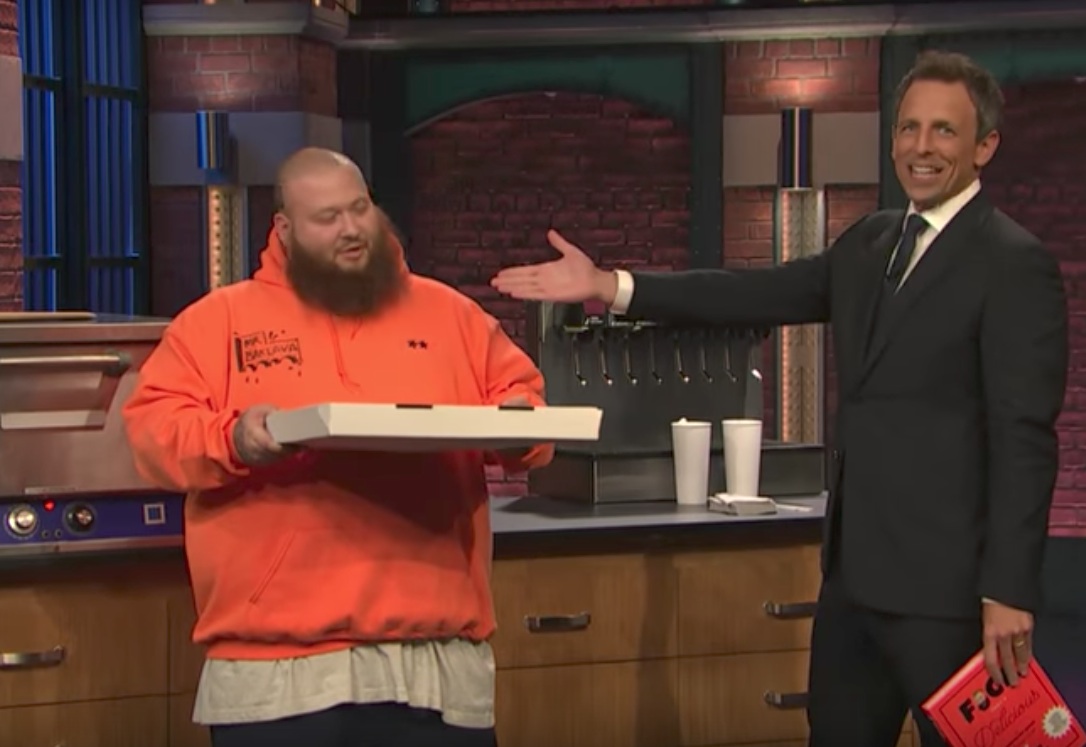 Action Bronson still makes rap music, and sometimes he even performs that rap music on late-night TV; he was a musical guest on The Tonight Show last month. But right now, he devotes at least as much time to that celebrity-chef life. Last year, Seth Meyers invited Bronson onto his show to cook octopus. And last night, Bronson was back on Seth Meyers, promoting his Fuck, That's Delicious cookbook and showing off his new scalp tattoo. He brought Meyers a ziti pizza from his local Afghani pizzeria, proved inept at removing pizza from ovens, and cussed a bunch. He also asked Meyers to help him name his new late-night show even though they're going to be competitors. And he made fun of Meyers for taking steroids. It's fun! Watch it below.