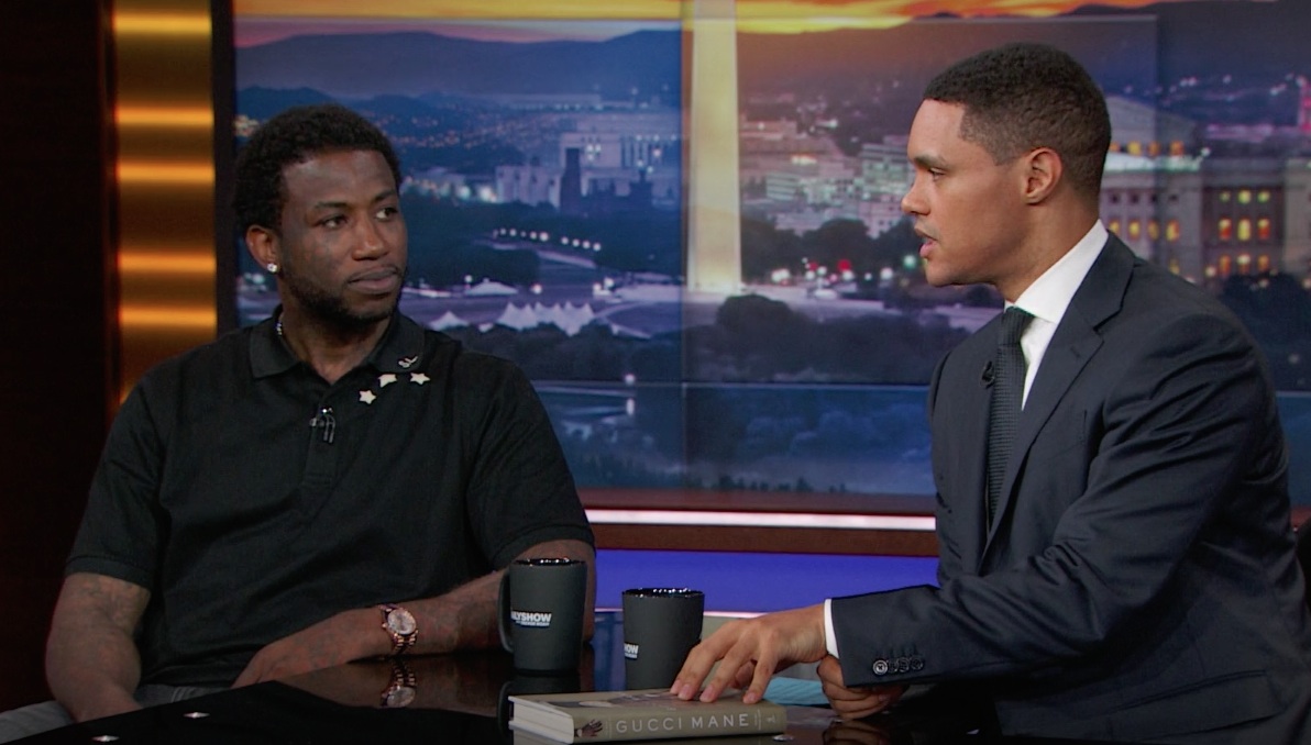 Back when Gucci Mane was at his circa-'09 artistic peak, he couldn't even get booked as a performer on a late-night show. But with his post-prison career revival in full swing and his autobiography coming out next week, Gucci is now getting the sit-down interview treatment. Last night, Gucci was a guest on Trevor Noah's Daily Show, talking about how he would've been a drug kingpin if he hadn't been a rapper and admitting that he fell asleep while filming a Spring Breakers sex scene because he was "high as hell." Gucci is a charming weirdo, and you can watch the interview below.