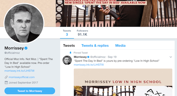 Just in case you happened to think that it was actually Morrissey himself sending out promotional tweets from his newly-crafted Twitter, the account's description has been updated with a helpful addendum: "Not Moz." You hear that, people? "Not Moz." Only "Official Moz Info." at @officialmoz. This has been your daily Morrissey update!