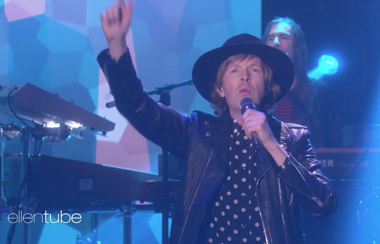 Last week, Beck released Colors, his long-awaited uptempo pop album. We didn't like it, but some people did, and Beck is now out on the promo circuit. Earlier today, he appeared as a musical guest on Ellen -- the same episode, in fact, where his fellow early-'90s Los Angeles trailblazer Snoop Dogg showed up to talk about getting nominated for an Emmy. On Ellen, Beck wore a very big hat, pogoed a bunch, and sang the peppy single "Up All Night." Watch the performance below.