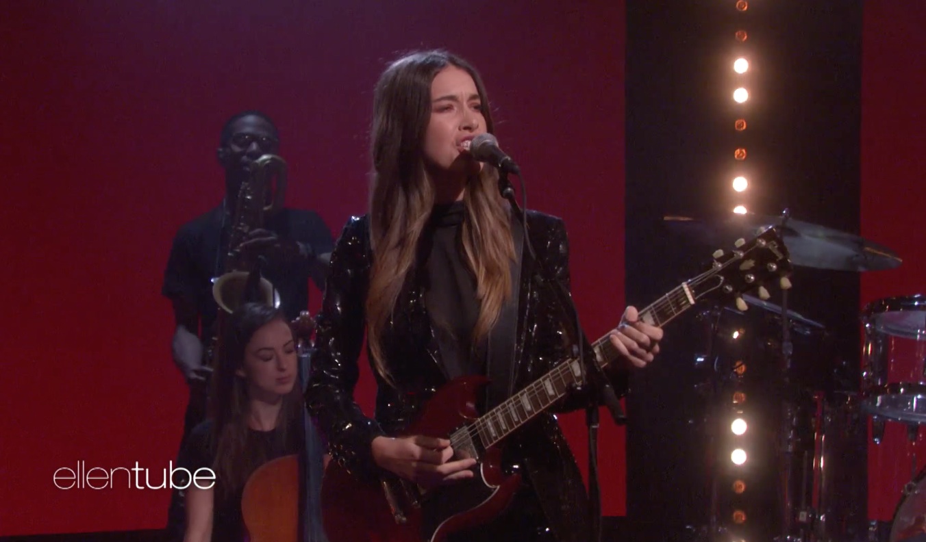 Ellen DeGeneres seems to be on some kind of mission to show up on Stereogum as much as possible. Already this week, she has had Beck and Arcade Fire on her show. And on today's show, she brought on HAIM, who played their fun, catchy current single "Little Of Your Love." HAIM had full string and horn sections with them, and they also had a stage setup that made the Ellen show look way more '70s than usual. They remain one of the most fun-to-watch bands out there. Este continued to make amazing faces, the two younger sisters played casually badass guitar solos, and Danielle wore all sparkly black and looked awesome. Watch the performance below.