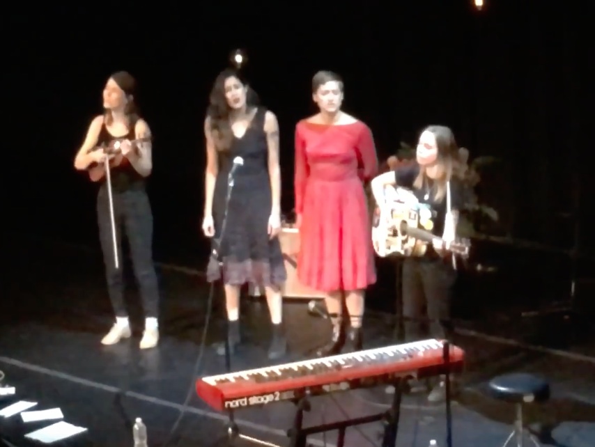 On Friday, Julien Baker released her absolutely astonishing new album Turn Out The Lights. And on Friday night, she headlined her biggest-ever New York show at Town Hall, a gorgeous and ornate seated venue in the middle of Town Hall. Baker has lately been touring with two other women who come from the DIY scene, Half Waif's Nandi Rose Plunkett and Petal's Kiley Lotz. And during the final songs of the evening, both Plunkett and Lotz joined Baker onstage, as did Camille Faulkner, the violinist who played on some of the songs from Turn Out The Lights. The four of them clustered around a single microphone and sang a haunting version of "Good News," a devastating song from Baker's 2015 debut Sprained Ankle. Watch a fan-made video below, via Brooklyn Vegan.