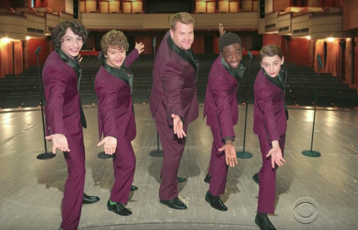 On last night's episode of his Late Late Show, Corden welcomed Stranger Things stars Finn Wolfhard, Gaten Matarazzo, Caleb McLaughlin, and Noah Schnapp. Together, the four of them submitted to a very, very long comedy bit. The idea is that all four of them were school friends with Corden -- he'd been held back -- and they had a Motown cover band together called the Upside-Downs. Corden was the one who didn't get cast in Stranger Things, but they reunited on the show to sing "I Want You Back," "My Girl," and "Reach Out (I'll Be There)." The kids all commit really hard, and Corden does James Corden things. Watch the video below.