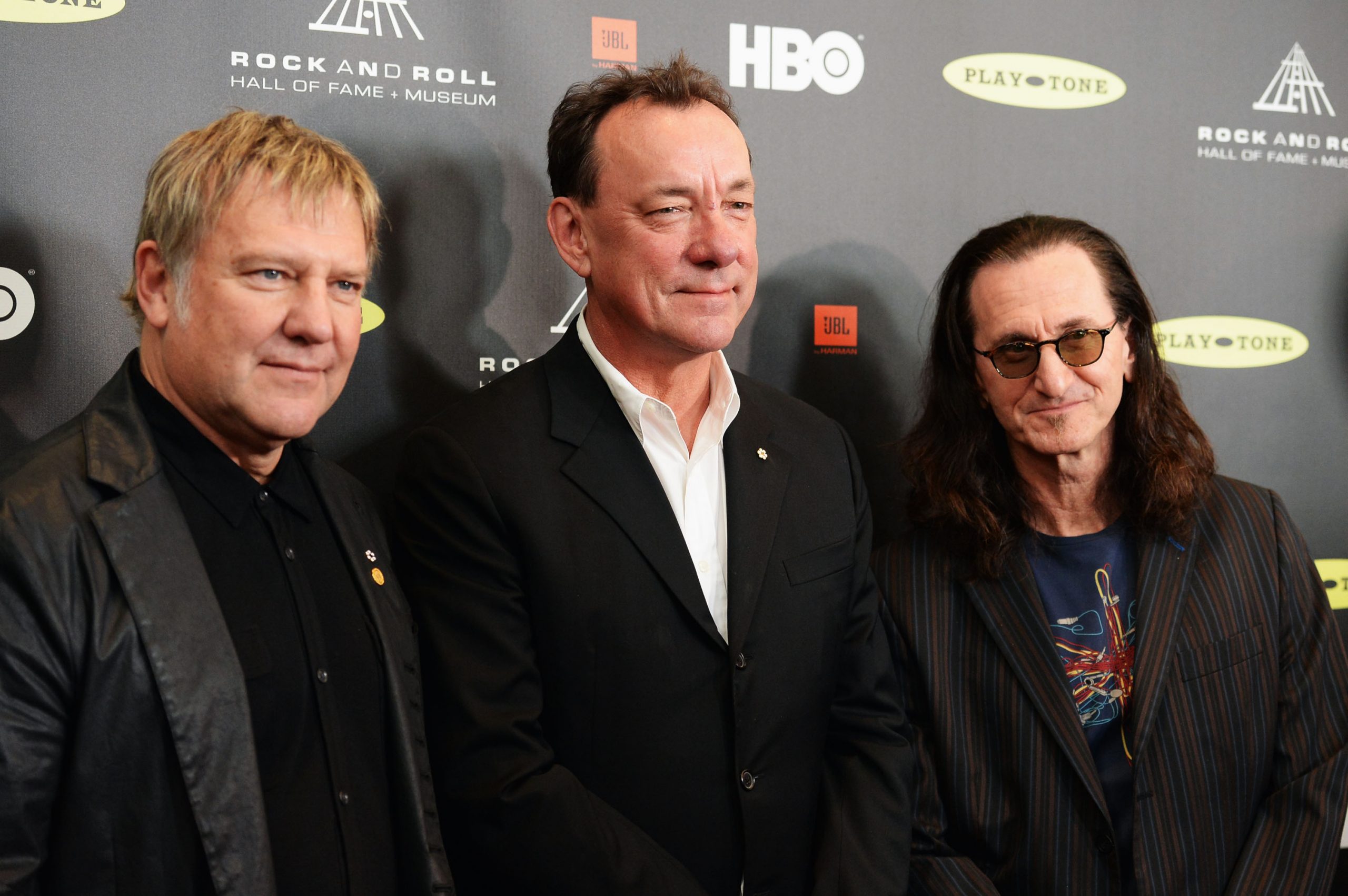 LOS ANGELES, CA – APRIL 18: (L-R) Inductees Alex Lifeson, Neil Peart and Geddy Lee of Rush arrive at the 28th Annual Rock and Roll Hall of Fame Induction Ceremony at Nokia Theatre L.A. Live on April 18, 2013 in Los Angeles, California. (Photo by Jason Merritt/Getty Images)