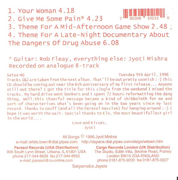 MISHRA: I basically learned an E-shape and had to move it up and down the guitar, and then wrote a set full of songs around that and a D-shape up and down, and that was it. So that was the first incarnation of White Town. I come from the electronic solo home recording thing, become this guitar thing, and that went really well and we got a lot of nice fanzine attention and people putting out records. Parasol [Records] got in touch around that time. But at the same time the band fell apart because it was only really me that was that was interested in it, and there was the classic musical differences of people liking the Stone Roses too much and that kind of thing. So it was back to just being me. For a while I tried to make it me, a drum machine, and a guitarist or bassist, but they just kept coming and going. It's a good thing that I'm an egomaniac because I've never found anybody else who really likes my songs as much as I do.